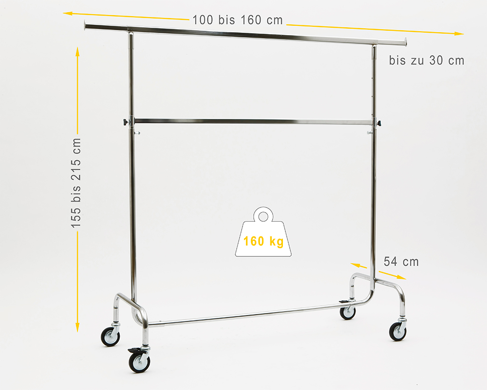 Diese Kleiderständerserie ist perfekt für Kaufhäuser, Catering sowie Transportunternehmen konzipiert. Durch dickwandige Stahlrohre erhält dieses Modell höchste Qualität bzw. Haltbarkeit, Standfestigkeit und Belastbarkeit von 160 kg. Somit bestens geeignet für schwere und lange Hängeware wie z.B. Jacken und Mäntel.